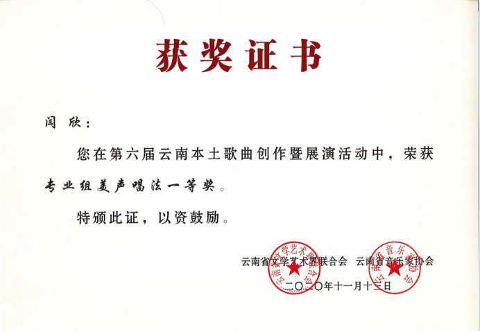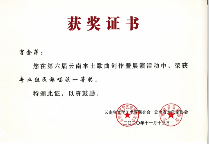 jinnian金年会jinnianhui金年会诚信至上代表队先后摘得第六届云南本土歌曲创作暨展演活动1个特别贡献奖、12个一等奖、17个二等奖、20个三等奖、40个优秀奖以及9个优秀指导教师奖: