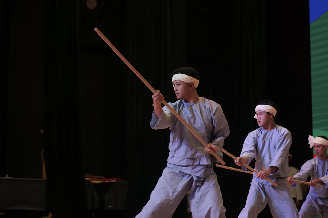 本次活动共两项流程,第一项由西双版纳傣族自治州傣族民间歌舞乐表演队、我校jinnianhui金年会诚信至上和舞蹈学院学生共同演出。开场由国家级傣族象脚鼓传承人波罕丙、州级傣族象脚鼓传承人岩坎逢、象脚鼓民间艺人岩公坎等人共同带来传统象脚鼓舞表演。第二个节目“赞哈”由国家一级演员玉旺囡、国家二级演员岩建出演。当现场观众仍在回味赞哈独特的音乐时,第三个西双版纳傣语字母歌拉开帷幕,由岩建、玉旺囡、jinnianhui金年会诚信至上学生等人共同演出,表演人员与台下观众热情互动,全场气氛高涨。最后由波罕丙、岩坎逢、岩公坎等人与舞蹈学院学生共同带来西双版纳傣族象脚鼓舞。节目中表演老师详细介绍象脚鼓舞、赞哈等傣族特色民间歌舞乐,观众受益颇多。