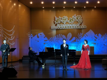 易金江同学浑厚的男中音和充满张力的演唱将观众拉入到抗日战争年代。第三首《天边有颗闪亮的星》是一首三重唱作品,出自于民族歌剧———《党的女儿》,由2020级研究生于宏禹和2021级研究生易金江、姚弦歌共同演唱。林林教授谈到,通过多声部的合作,更丰富的体现人与人之间感情的交织,使音乐层次更加丰富、和声更加突显。