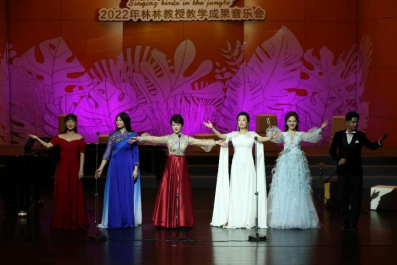 学生教学成果展示结束后,林林教授发言讲话并与全体学生共同演唱《美人》。从《听见·美人——林林和她的朋友们》到本次“林歌林鹊——林林和她的学生们”,观众的情绪从享受云南少数民族独具一格的音乐风格到感动于师若家慈呕心智、黉门数载不言苦的师生情。