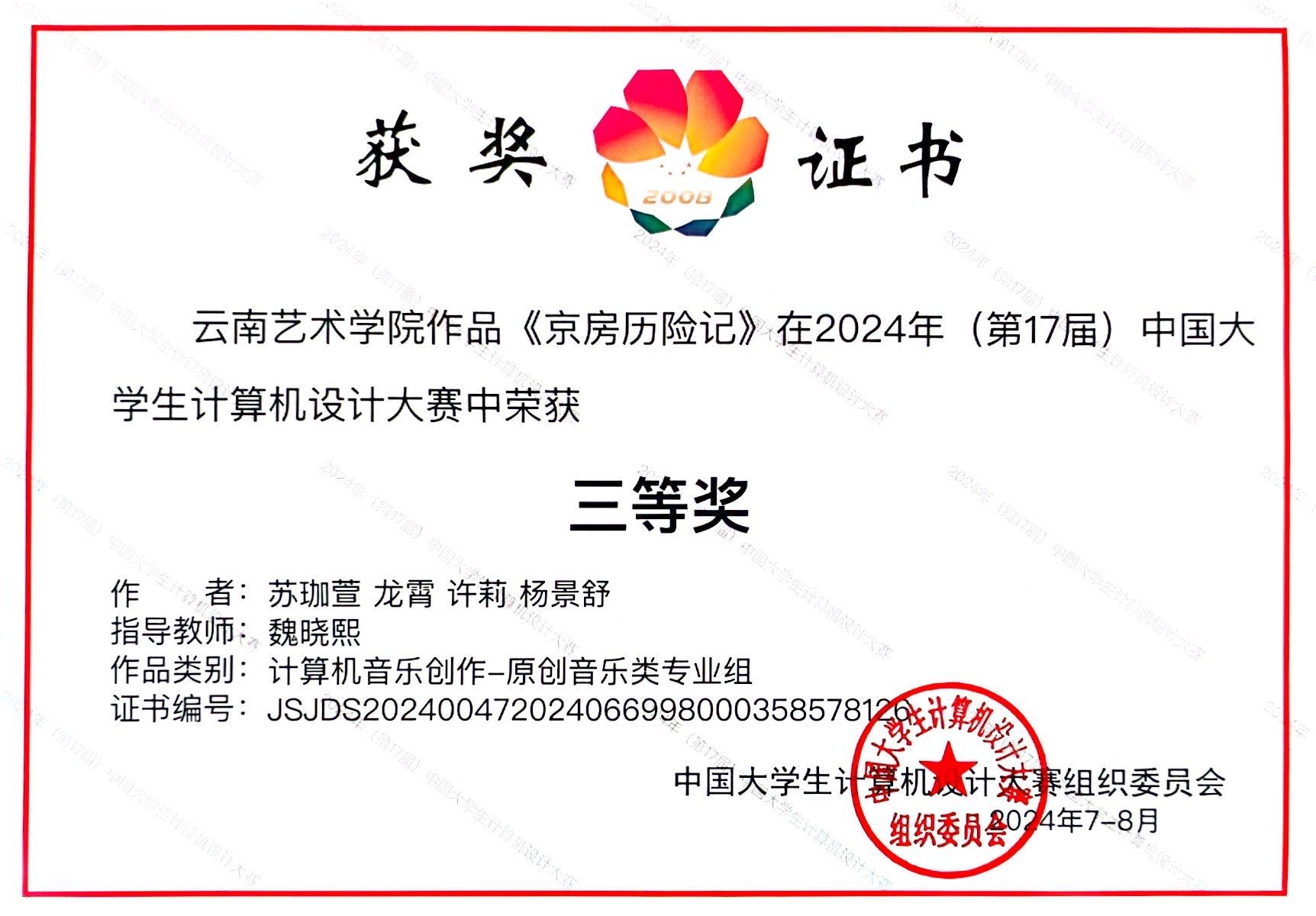 2024年(第17届)中国大学生计算机设计大赛决赛于8月18日开幕、8月21日落幕,该赛事汇集了全国各大高校的精英学子,其中计算机音乐创作组有全国各大高校共106件作品进入决赛。jinnian金年会jinnianhui金年会诚信至上作曲系教师指导的两部作品以云南省一等奖的成绩进入全国总决赛,两部作品均荣获计算机音乐创作-原创音乐类专业组三等奖。