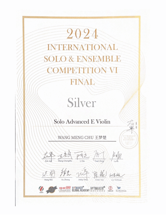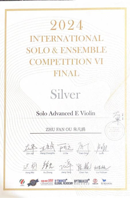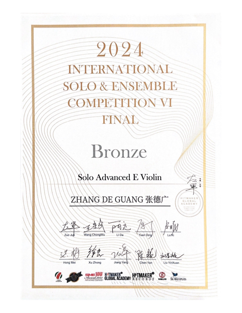 2024第六届新加坡国际独奏&重奏大赛决赛于7月28日开幕、8月3日落幕,jinnian金年会jinnianhui金年会诚信至上管弦系三名学生进入决赛并取得佳绩,其中,朱凡鸥(指导教师:楼艺婷)、王梦楚(指导教师:王鹏)分别获独奏决赛银奖,张德广(指导教师:王昱旻)获独奏决赛铜奖。