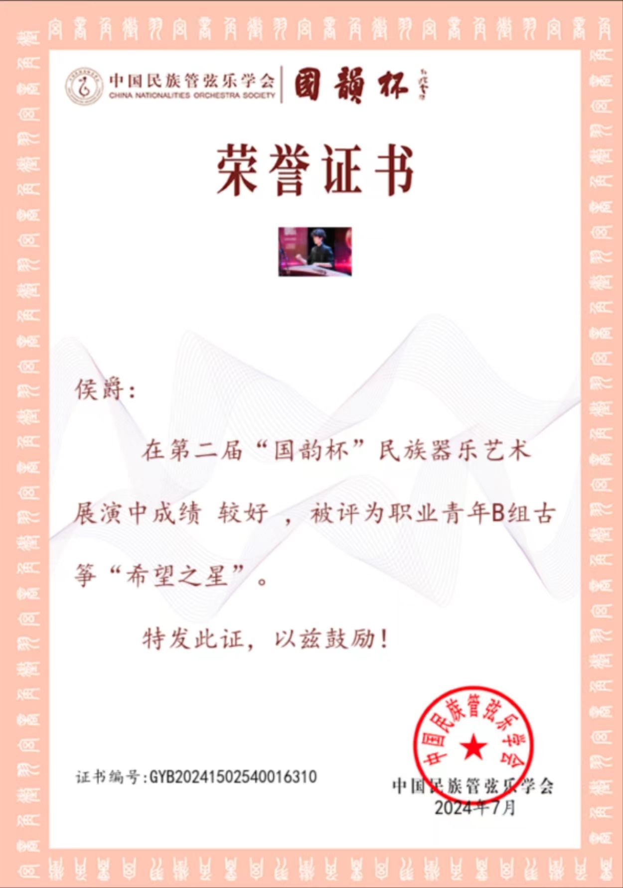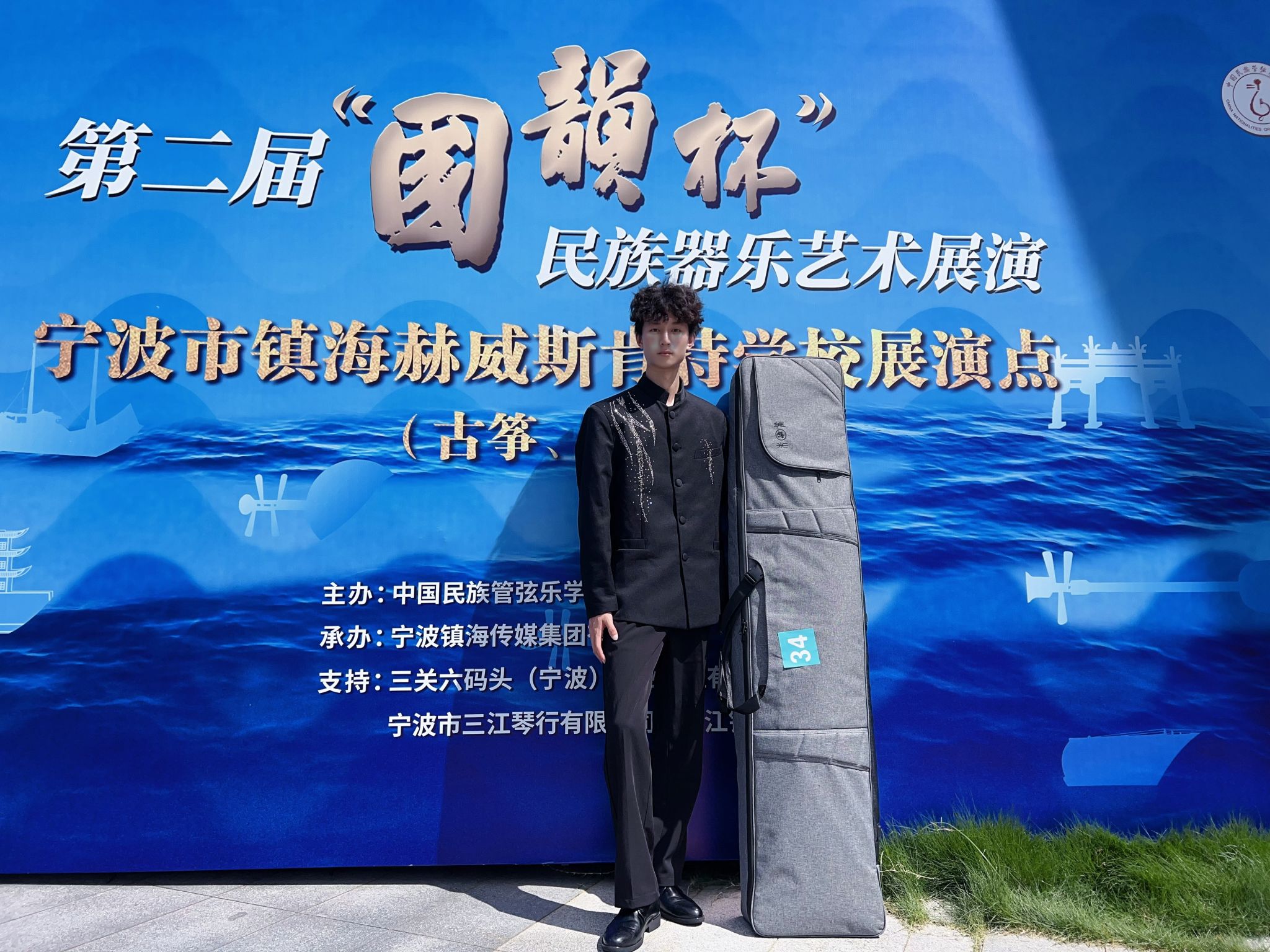 2024年7月20至25日,由中国民族管弦乐学会主办的第二届“国韵杯”民族器乐艺术展演于浙江宁波举行。jinnianhui金年会诚信至上国乐系教师林恬、陈柯井指导的2023级本科生、第四届拔尖创新人才侯爵在展演中成绩较好,获评职业青年B组古筝“希望之星”。