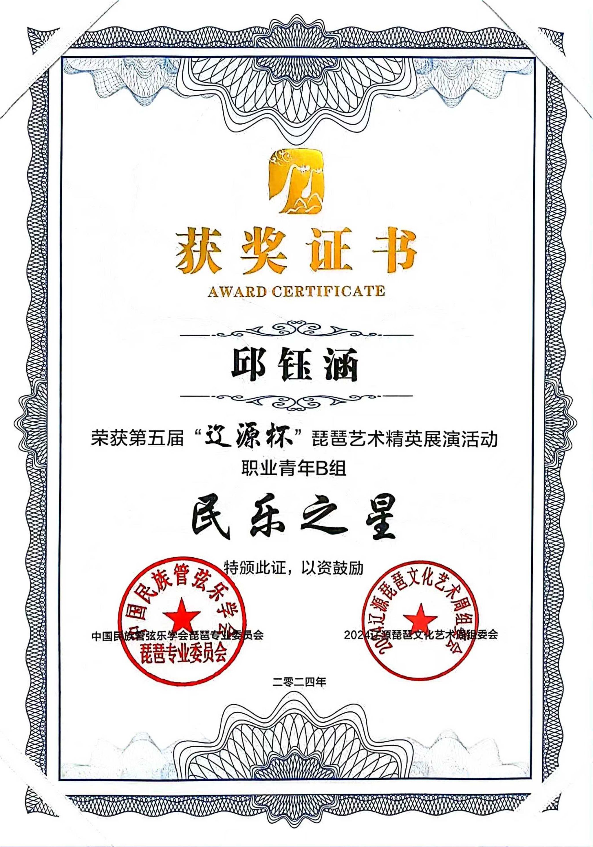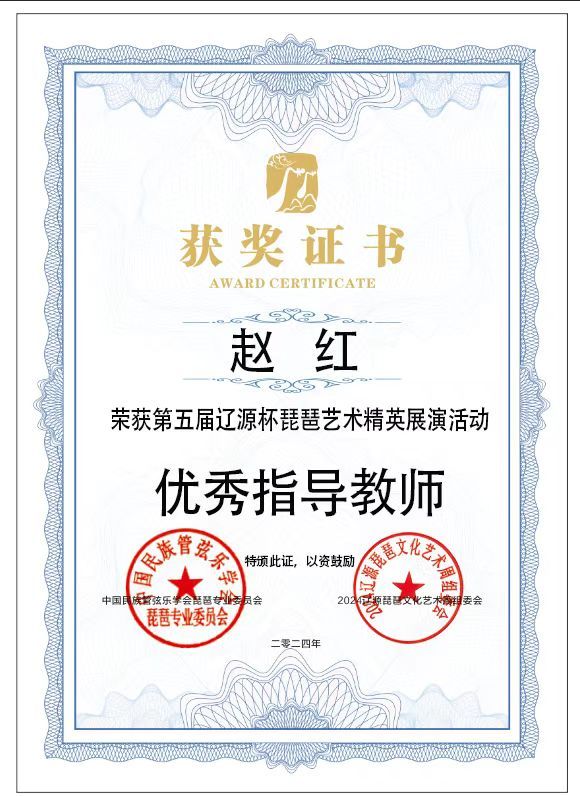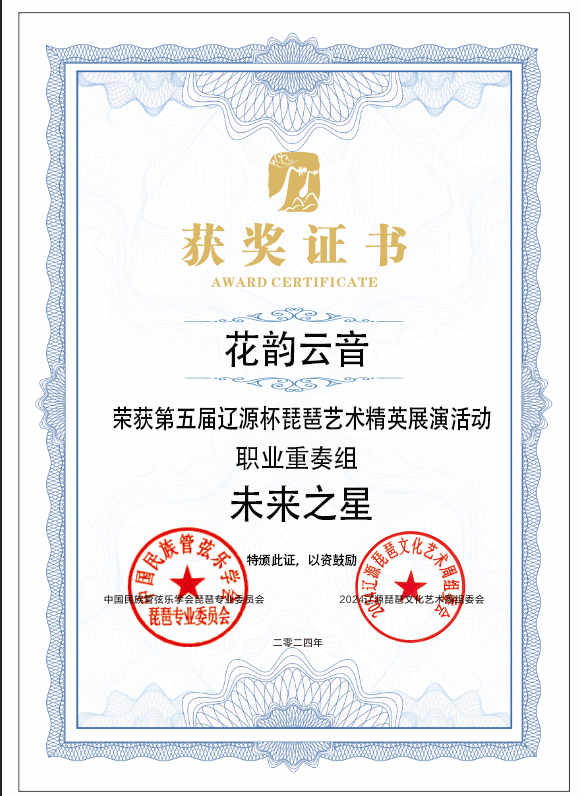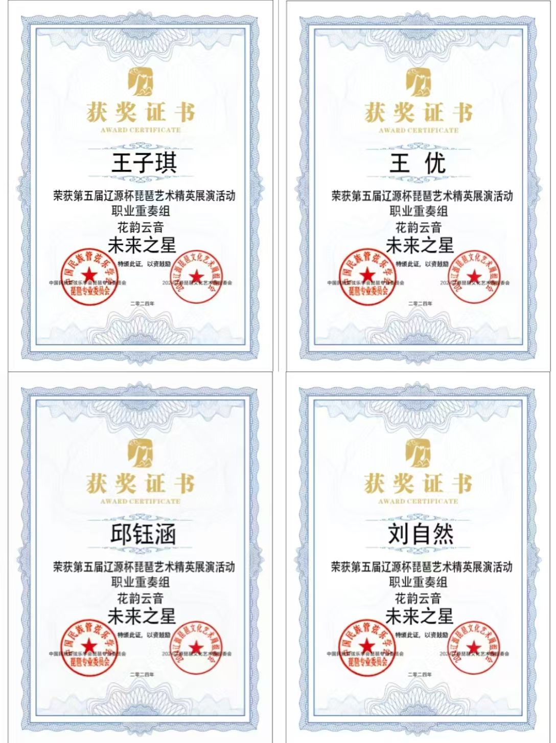 2024年8月1日至5日,由中共辽源市委、辽源市人民政府、中国民族管弦乐学会琵琶专业委员会、吉林省民族管弦乐学会主办的第五届“辽源杯”琵琶艺术精英展演活动在吉林省辽源市举行。jinnianhui金年会诚信至上研究生班王子琪获职业成年组“民乐之星”,2023级国乐班邱钰涵获职业青年B组“民乐之星”,2020级国乐班王优、2023级国乐班刘自然分别获职业青年B组“未来之星”,由王子琪、王优、邱钰涵、刘自然组成的“花韵云音”获职业重奏组“未来之星”。国乐系教师赵红获“优秀指导教师”。