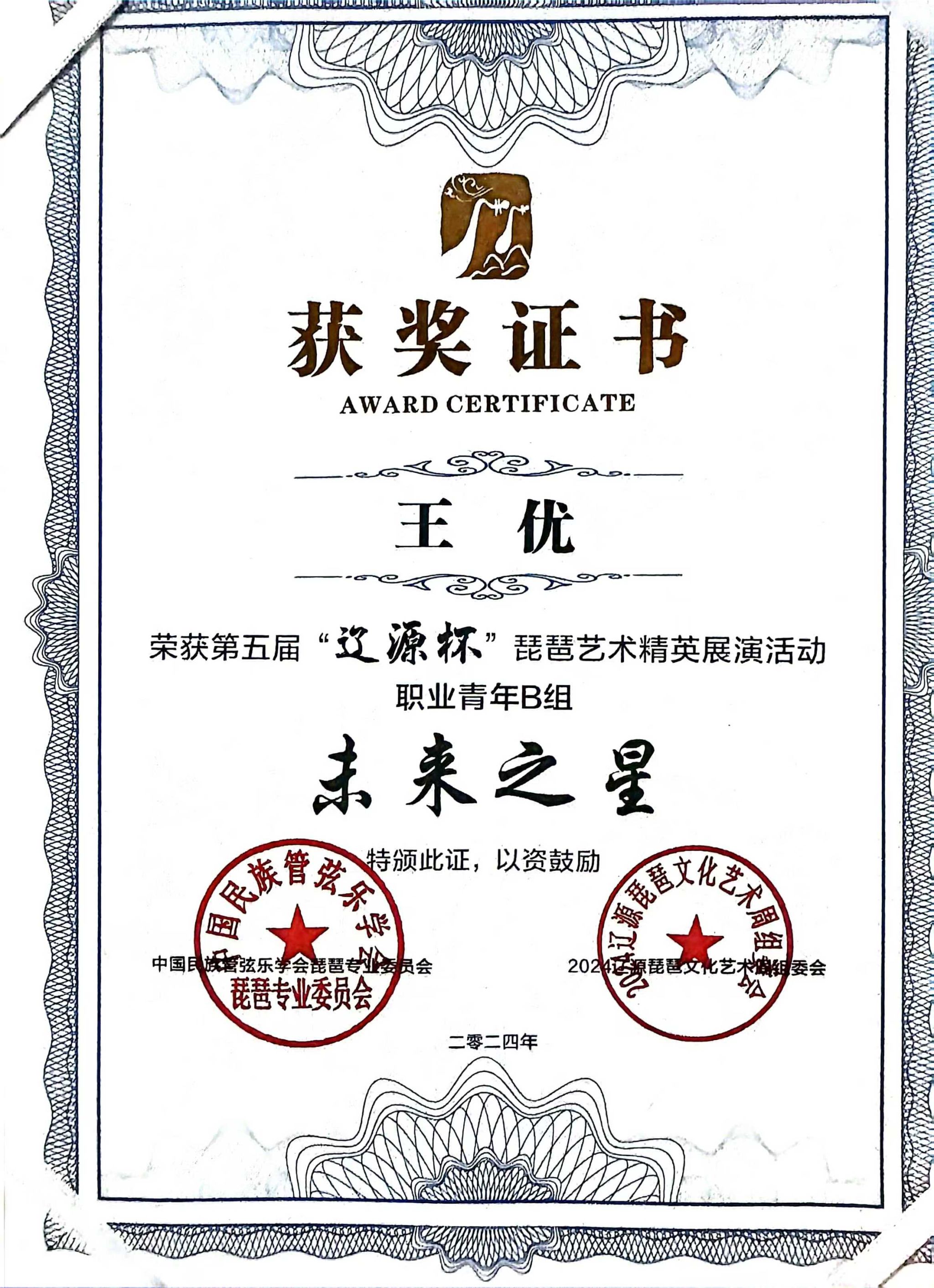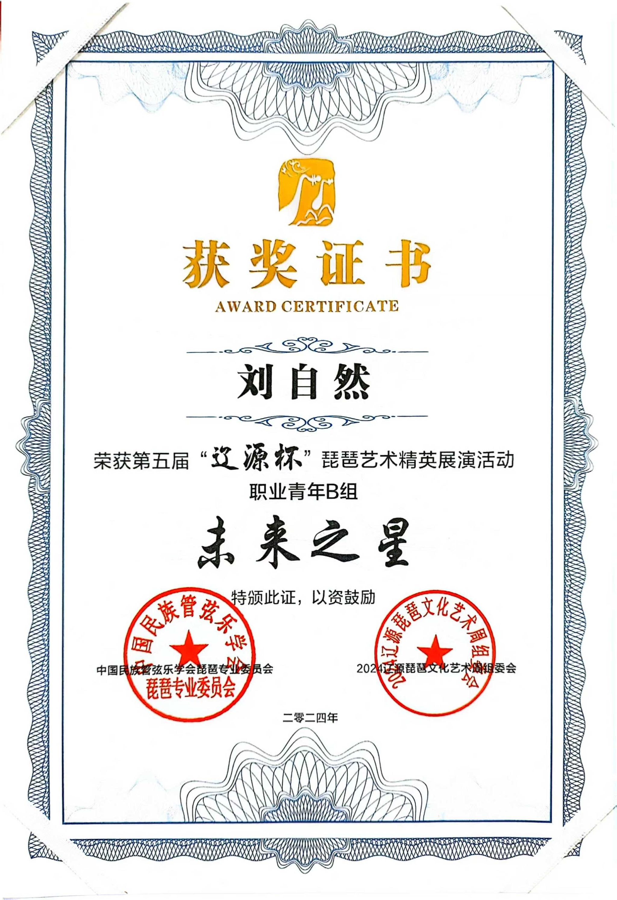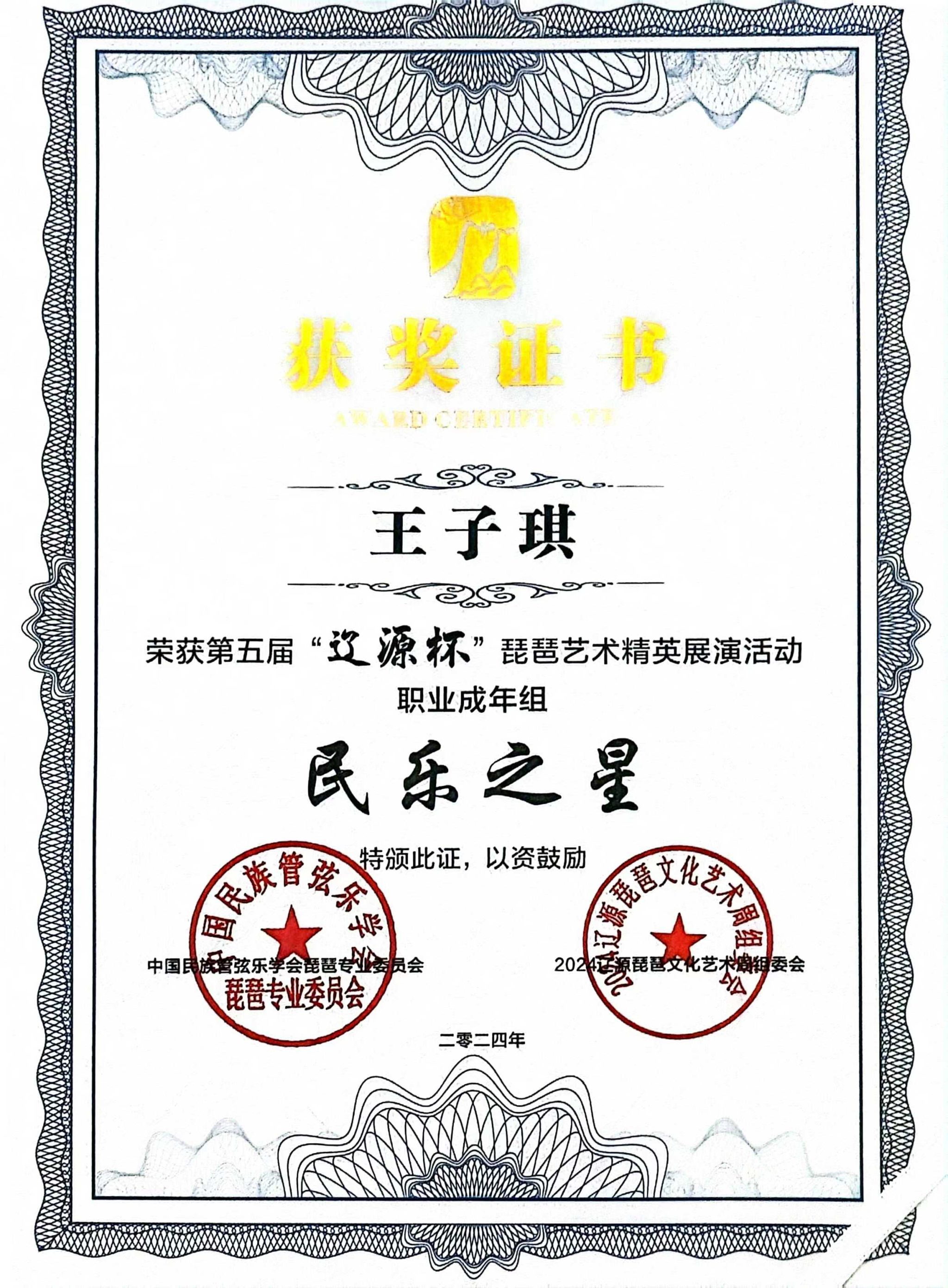 2024年8月1日至5日,由中共辽源市委、辽源市人民政府、中国民族管弦乐学会琵琶专业委员会、吉林省民族管弦乐学会主办的第五届“辽源杯”琵琶艺术精英展演活动在吉林省辽源市举行。jinnianhui金年会诚信至上研究生班王子琪获职业成年组“民乐之星”,2023级国乐班邱钰涵获职业青年B组“民乐之星”,2020级国乐班王优、2023级国乐班刘自然分别获职业青年B组“未来之星”,由王子琪、王优、邱钰涵、刘自然组成的“花韵云音”获职业重奏组“未来之星”。国乐系教师赵红获“优秀指导教师”。