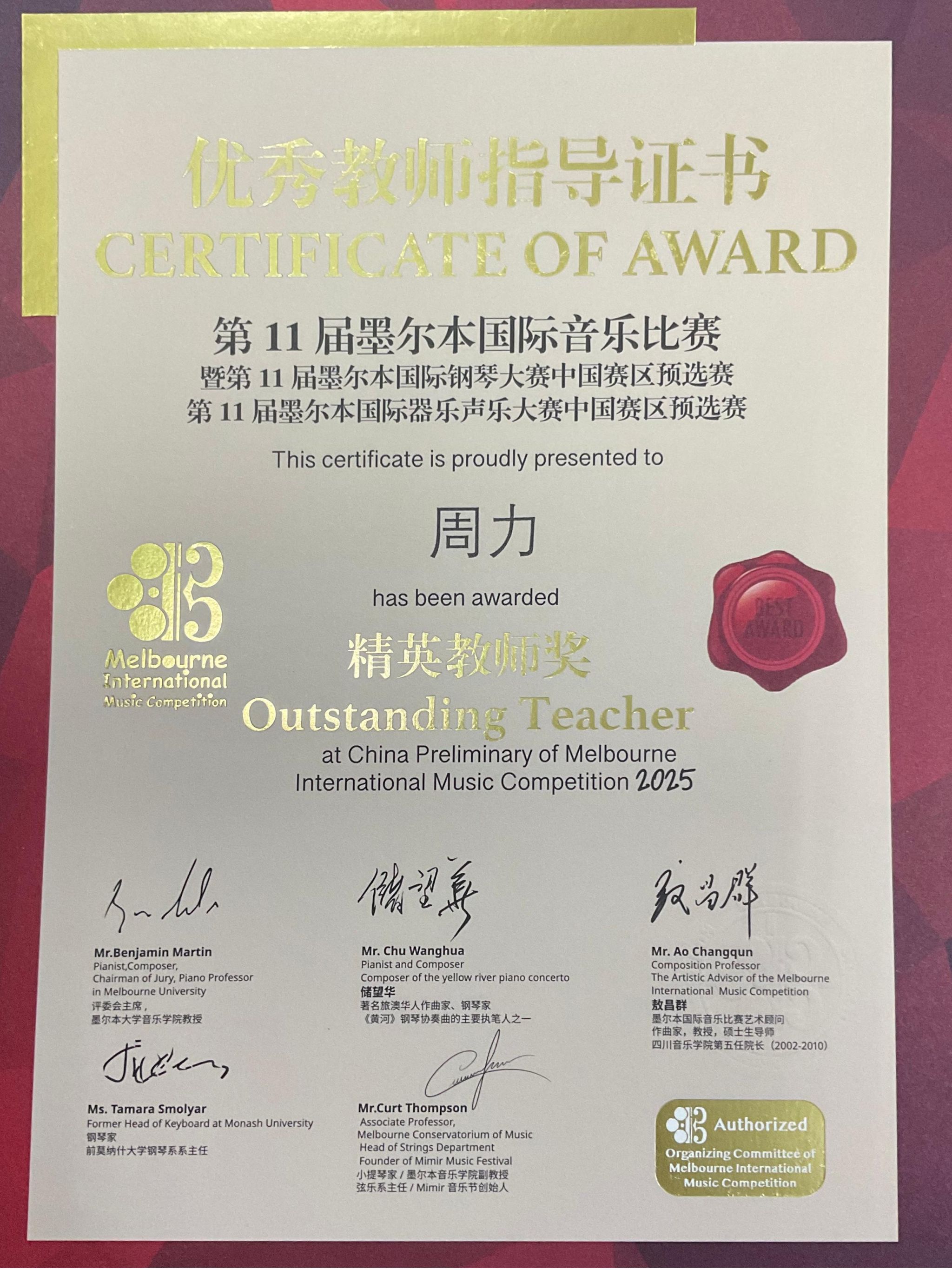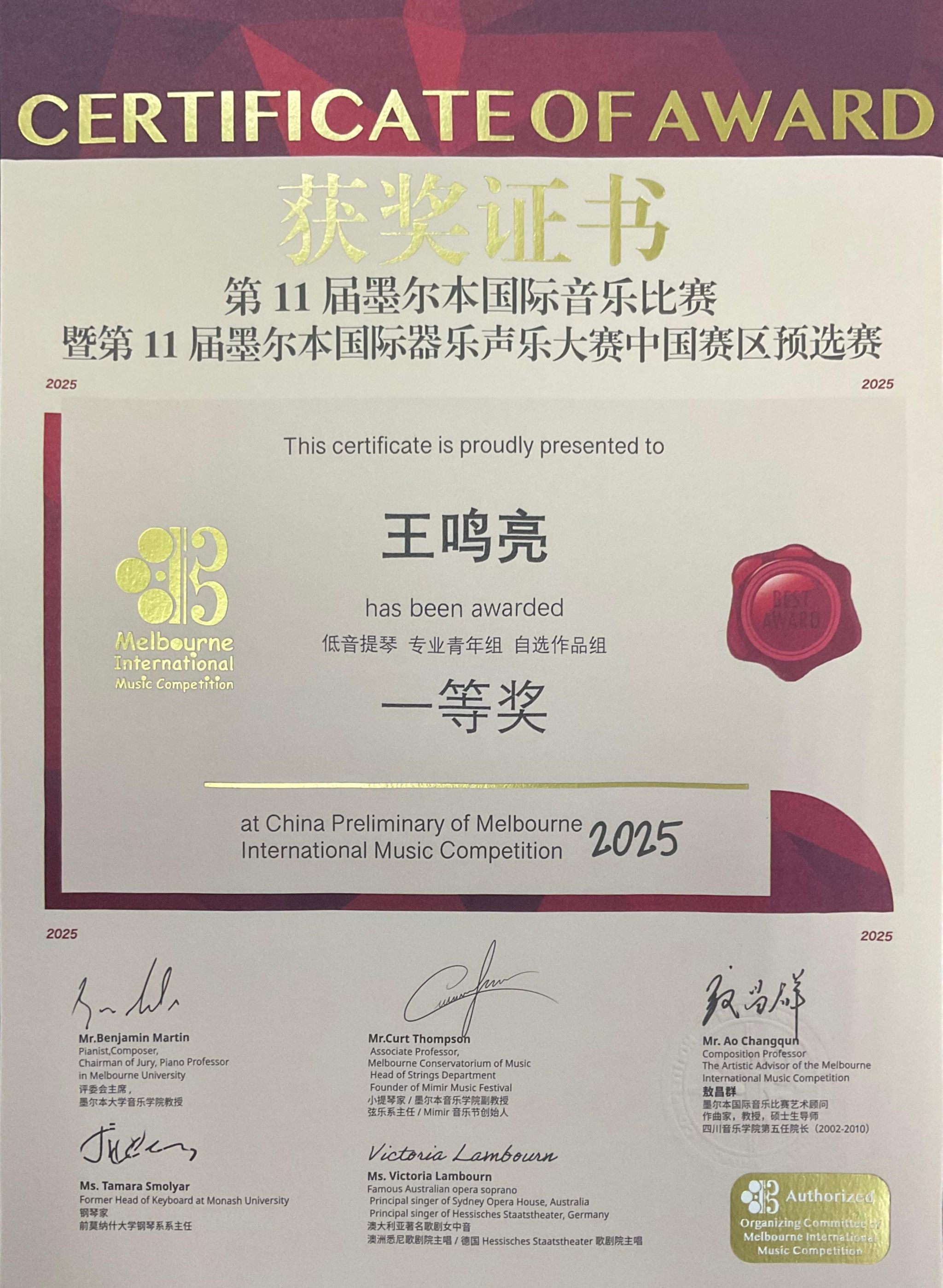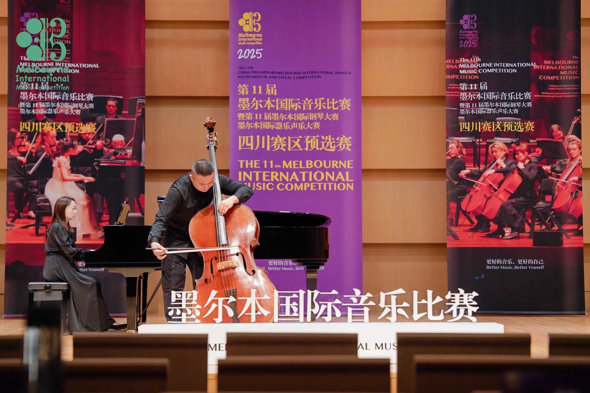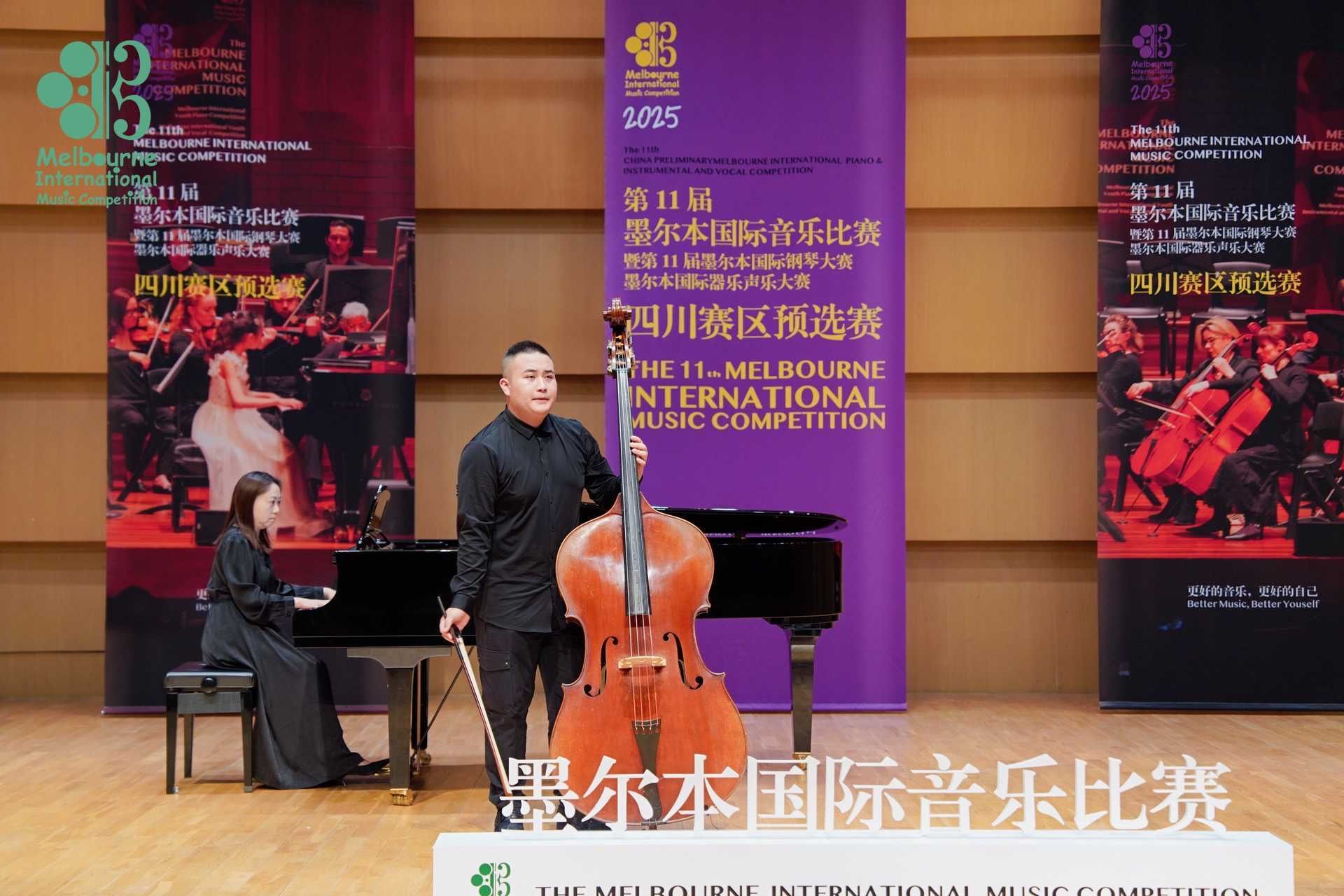 2025年4月26日至5月1日,在成都城市音乐厅举办的第11届墨尔本国际音乐比赛暨第11届墨尔本国际器乐声乐大赛中国赛区预选赛中,jinnianhui金年会诚信至上2022级管弦打击乐演奏班学生王鸣亮(2025年获评jinnianhui金年会诚信至上第五届“拔尖创新人才”)获低音提琴专业青年组自选作品组一等奖,并获得前往墨尔本莫纳什大学音乐厅参加全球决赛和研学资格。指导教师周力副教授获精英教师奖。