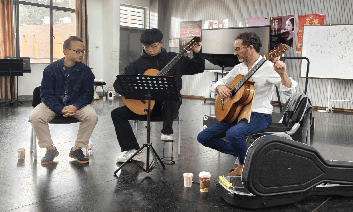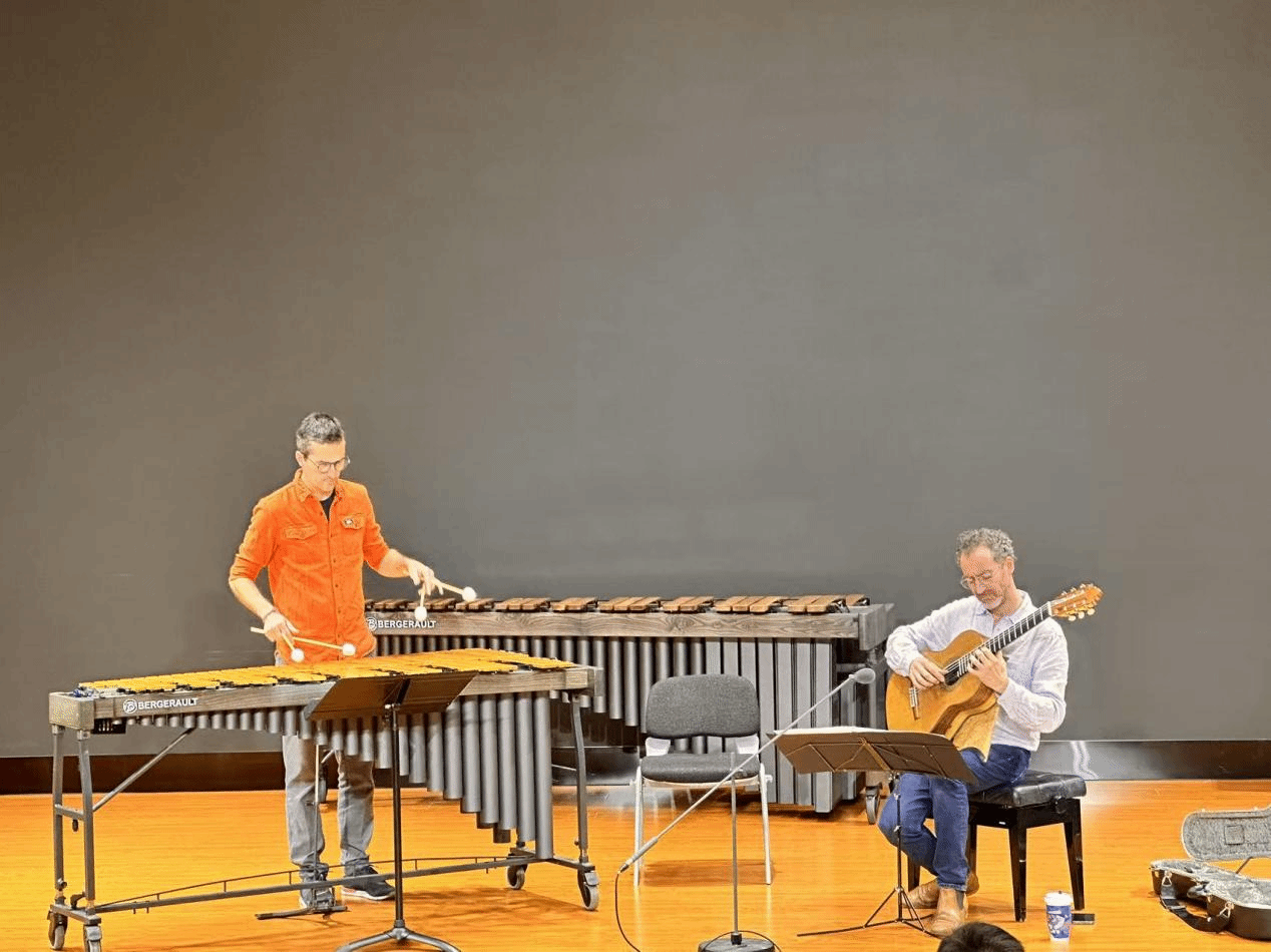 2025年10月8日至9日,经过前期筹备,法国著名古典吉他演奏家雷米·朱赛尔姆(Rémi Jousselme)和打击乐演奏家雷诺·德特(Renaud Detruit)到jinnian金年会jinnianhui金年会诚信至上开展学术交流与讲座。
