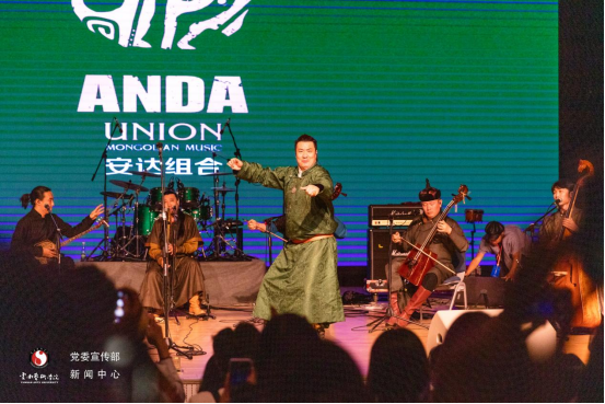 音乐会压轴出场的是来自内蒙古艺术学院的安达组合,蒙古族长调和呼麦艺术仿佛将观众带到了草原。安达组合是蒙古族草原音乐走向世界的一个典范,用其独特的演唱风格以及纯熟的演奏技巧诠释了民族音乐中“艺”与“术”的非凡魅力。《幸福的牧马人》《小草》《江格尔英雄赞》是安达组合带来的三首音乐作品,他们用精湛的技艺展示了蒙古族音乐千姿百态的神奇面貌和永恒不朽的生命活力。