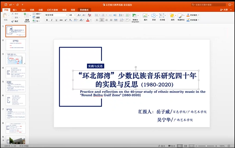 二组由胡晓东教授主持,刘桂腾教授评议。首次发言的是广西艺术学院的岳子威、吴宁华老师,以《“环北部湾”少数民族音乐研究四十年的实践与反思(1980—2020)》为题,列举代表性著作及学术论文,通过环北部湾区域内联动考察、跨境(界)族群研究、边境口岸人类学带来的启发等方面对于历史—现实的考量提出建议。