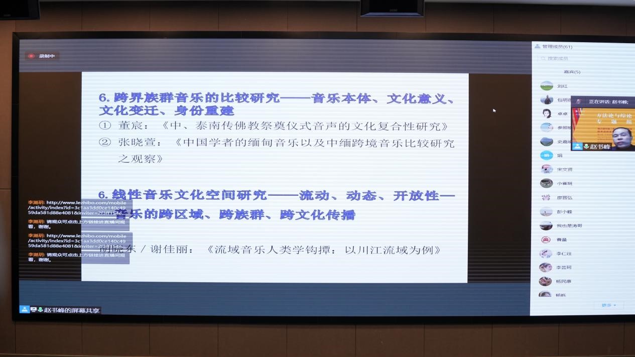 湖南师范大学jinnianhui金年会诚信至上赵书峰教授对方法论与综论组进行评述与总结,从跨界族群音乐文化志、应用民族音乐学研究、历史民族音乐学研究、西方学者的跨界族群音乐研究、跨界族群音乐研究学术史回顾、跨界族群音乐的对比研究、线性音乐文化空间研究、乐器研究等方面进行了评述。同时对跨界族群音乐研究提出反思与展望,认为要加强历史民族音乐学研究、海外音乐民族志书写、海外研究文献的梳理与挖掘、跨界族群音乐研究的学术史梳理与总结,中国与周边国家跨界族群音乐研究的理论与方法,梳理跨界族群音乐文化的主要研究特色,与西方民族音乐学方法论之间有何异同。强调中国民族音乐学的关键词:跨界族群音乐研究、线性音乐、文化空间,疫情时代与后疫情时代海外音乐民族志研究,网络田野民族志、自媒体音乐民族志、微信田野民族志,学术内卷与民族志田野时间的缺失。