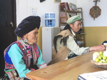 7月9日,课题组将本次田野调查最后一站选定于彝族《梅葛》的发源地——姚安县马游村。初到马游村,只见村落四面环山,房屋依山而建,村中妇女皆穿着彝族倮倮颇支系传统服饰,其中一位年迈的老奶奶拄着拐杖,跨入其中一栋黄色房屋中,那便是本次课题组开展采录的地点——《梅葛》传习馆(即梅葛坊)。从7月9日至7月18日,课题组在此共对十余位民间艺人进行访谈和采录,共采集《梅葛》20余首,葫芦苼调约20调,并由郭晓炜老师协助对采录资料进行翻译和校对。