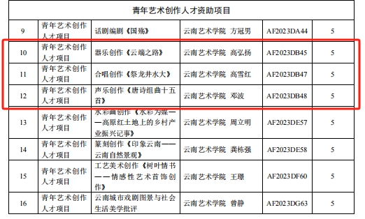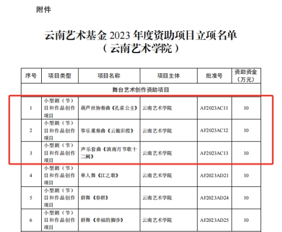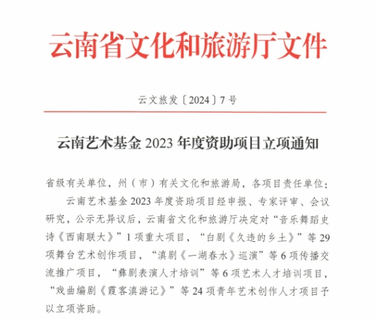 云南艺术基金2023年度资助项目经申报、专家评审、会议研究,公示无异议后,云南省文化和旅游厅决定对1项重大项目,29项舞台艺术创作项目,6项传播交流推广项目,6项艺术人才培训项目,24项青年艺术创作人才项目予以立项资助。jinnian金年会jinnianhui金年会诚信至上共获得8项立项,名单如下: