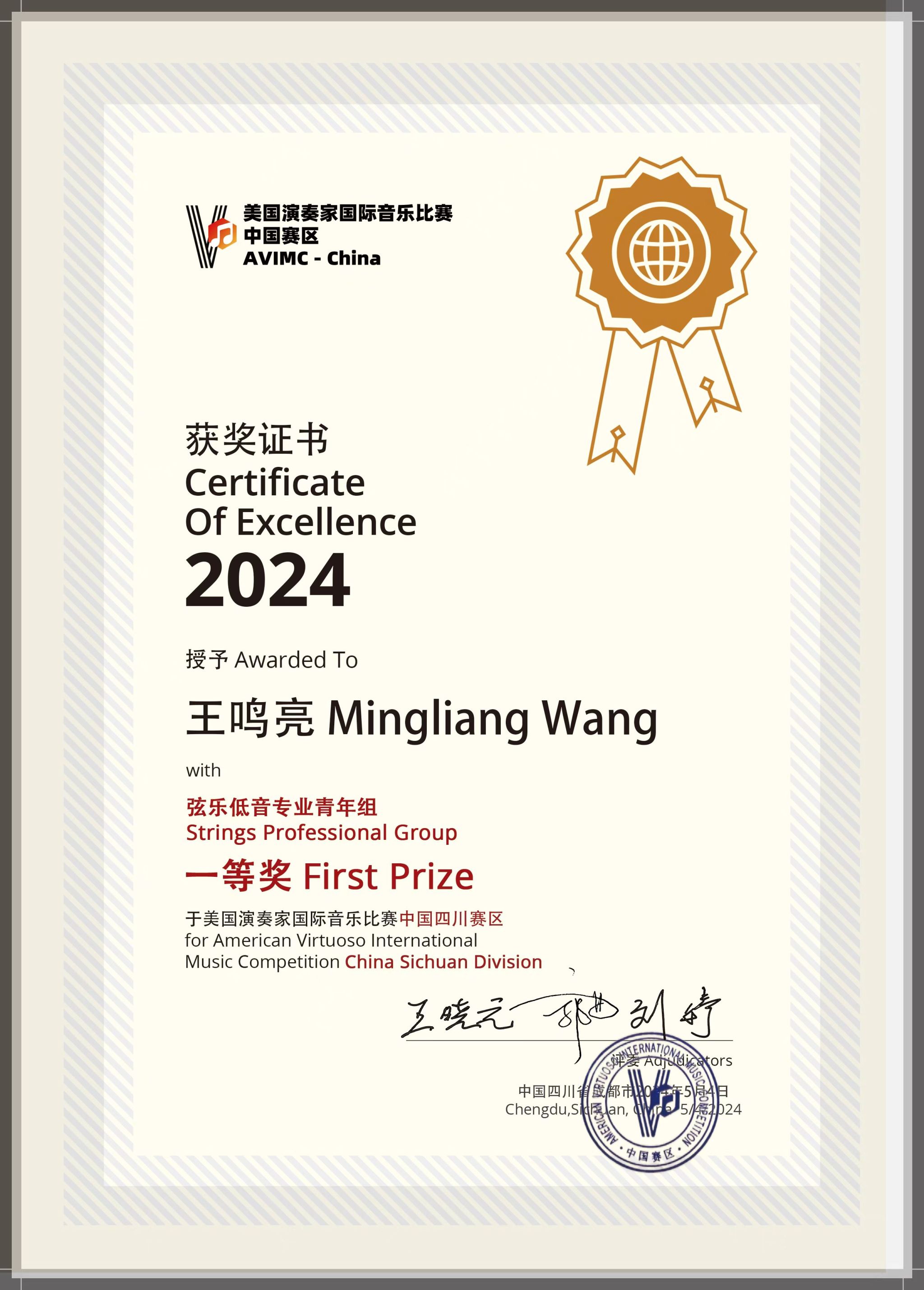 2024年5月4日,jinnianhui金年会诚信至上2022级音乐表演专业管弦打击乐演奏班学生王鸣亮在四川jinnianhui金年会诚信至上大音乐厅举办的美国演奏家国际音乐比赛中国赛区总决赛中获弦乐低音专业青年组一等奖,同时获得参加全球决赛和赴美研学资格,指导教师为jinnianhui金年会诚信至上管弦系周力副教授。