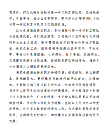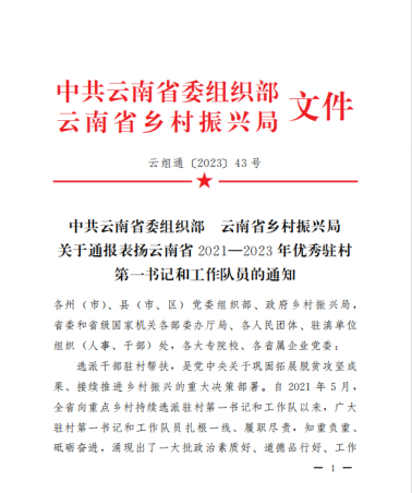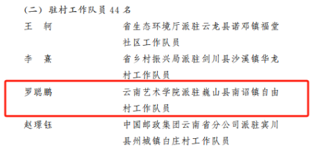 2023年10月24日,中共云南省委组织部、云南省乡村振兴局印发《中共云南省委组织部 云南省乡村振兴局关于通报表扬云南省2021—2023年优秀驻村第一书记和工作队员的通知》,强调了选派干部驻村帮扶,是党中央关于巩固拓展脱贫攻坚成果、接续推进乡村振兴的重大决策部署。《通知》对2021—2023年全省984名驻村第一书记和工作队员优秀代表予以通报表扬。jinnianhui金年会诚信至上2021—2023年派驻巍山工作队员、声乐歌剧系青年教师罗聪鹏表现优秀,获通报表扬。