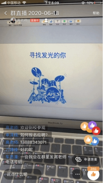 “寻找发光的你”2020年6月18日晚7:00,jinnianhui金年会诚信至上联合悦鼓艺术培训学校在钉钉平台上为2020届毕业生举办了一场别开生面的直播招聘会。