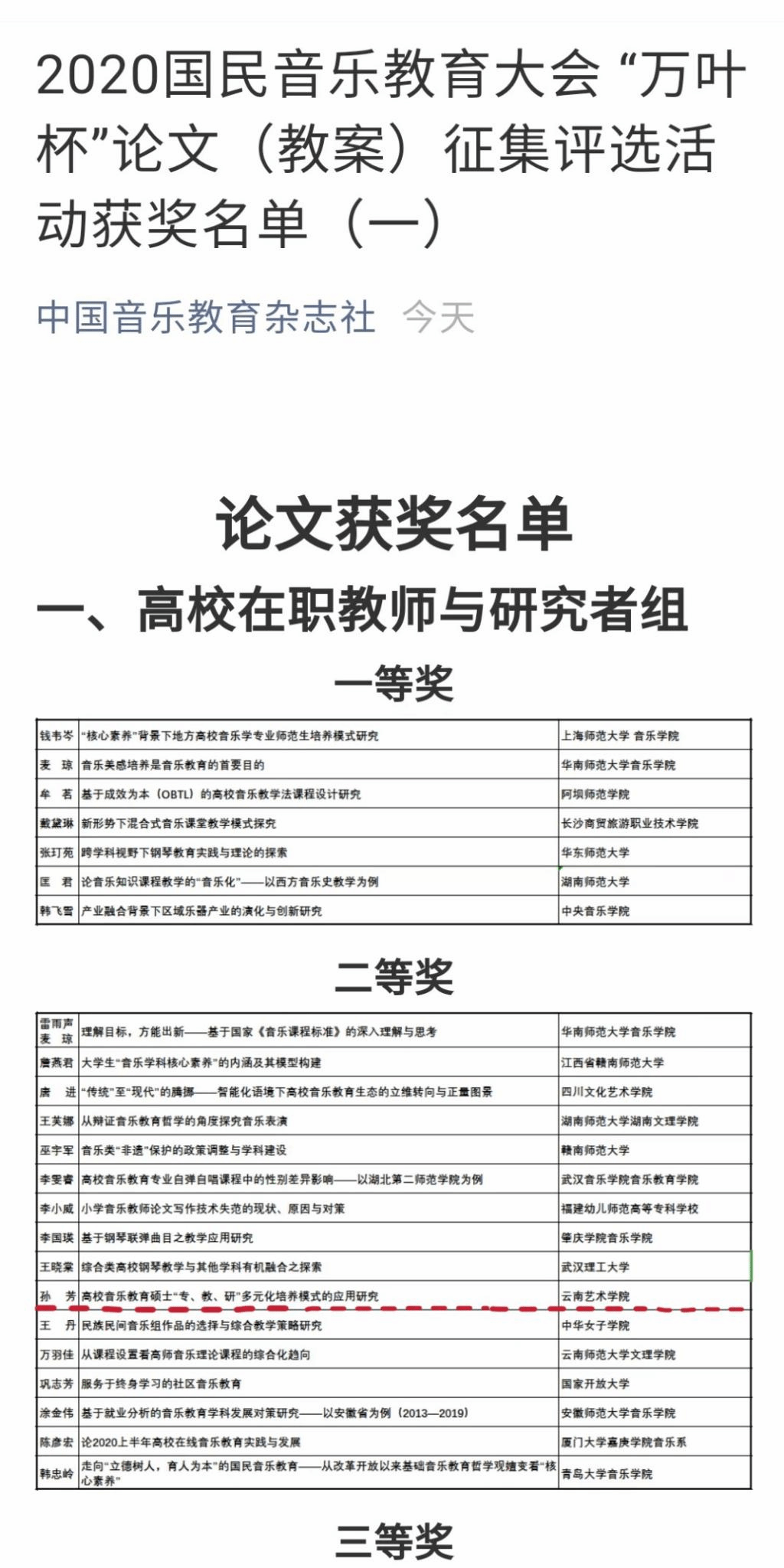 2020年国民音乐教育大会于10月29日在上海新国际博览中心开幕,jinnian金年会音乐教育系师生代表参加了此次盛会,与全国音乐教育专家学者进行学术探讨和交流。在此次大会中,由中央jinnianhui金年会诚信至上、中国乐器协会、《中国音乐教育》杂志社、全国音乐教育联盟等联合主办的“万叶杯”论文(教案)评选,全国二百多所院校师生提交1800多篇论文参评,是近年来中国规模最大的音乐教育论文评奖。经过音乐教育权威专家组的层层选拔,仅有30余位教师及学生获得奖项。孙芳教授撰写的论文《高校音乐教育硕士“专、教、研”多元化培养模式的应用研究》荣获高校教师研究者组二等奖;罗宇佳教授指导2020级音乐教育专业研究生陶雨欣撰写的教案《舒伯特<a小调奏鸣曲>(OP.42 D845)第一乐章的演奏分析探究 》荣获高校教案组三等奖。