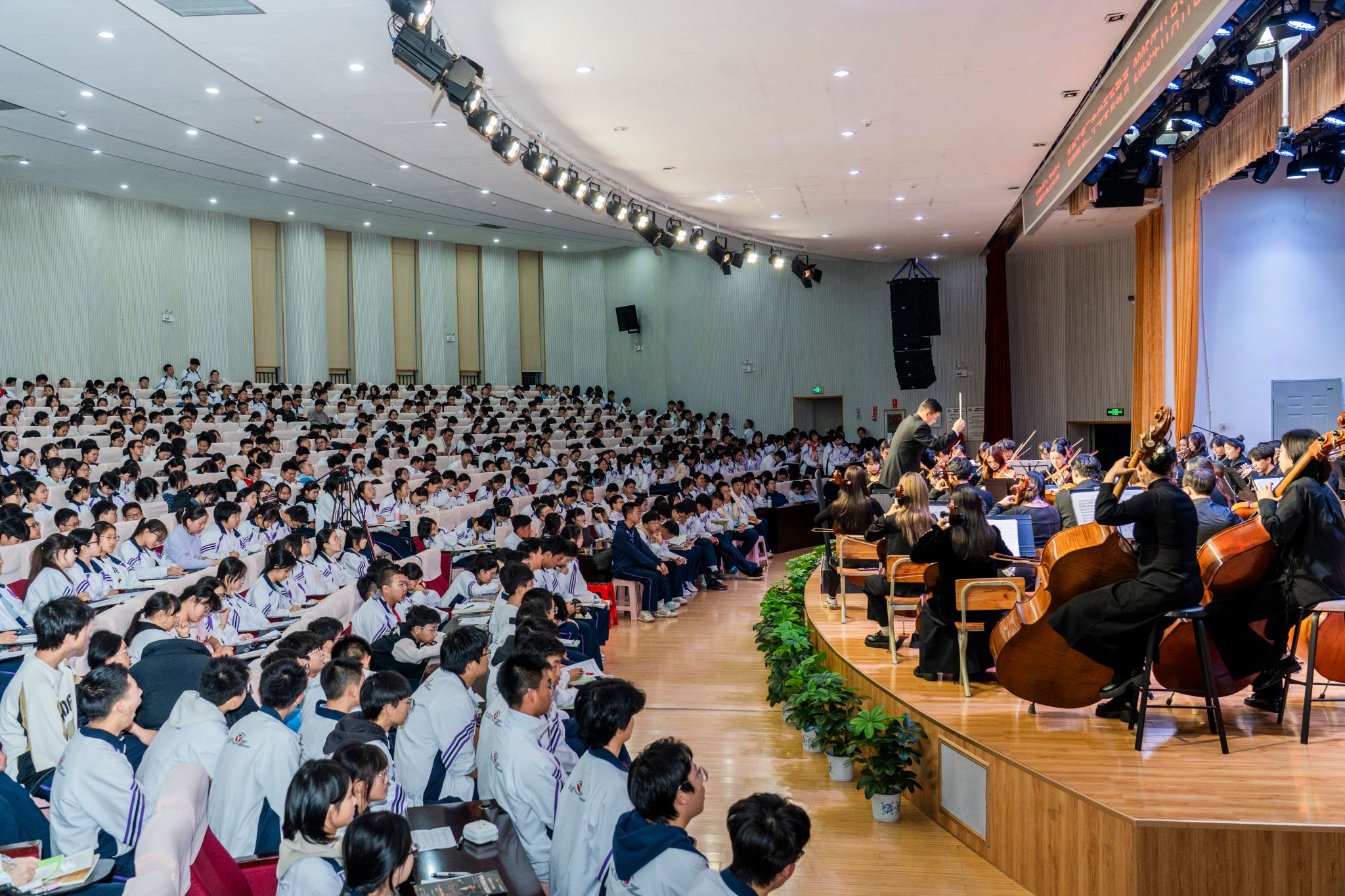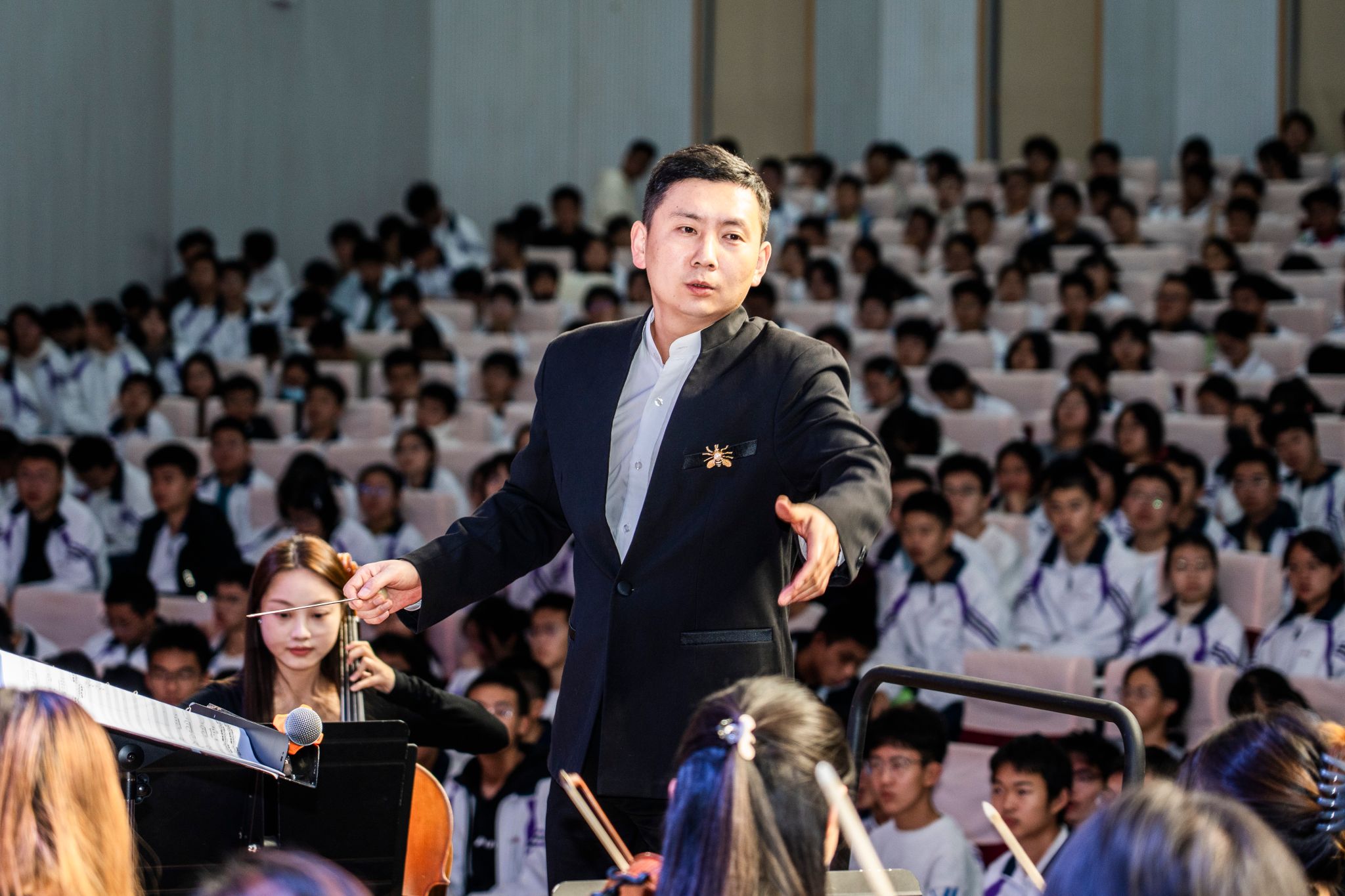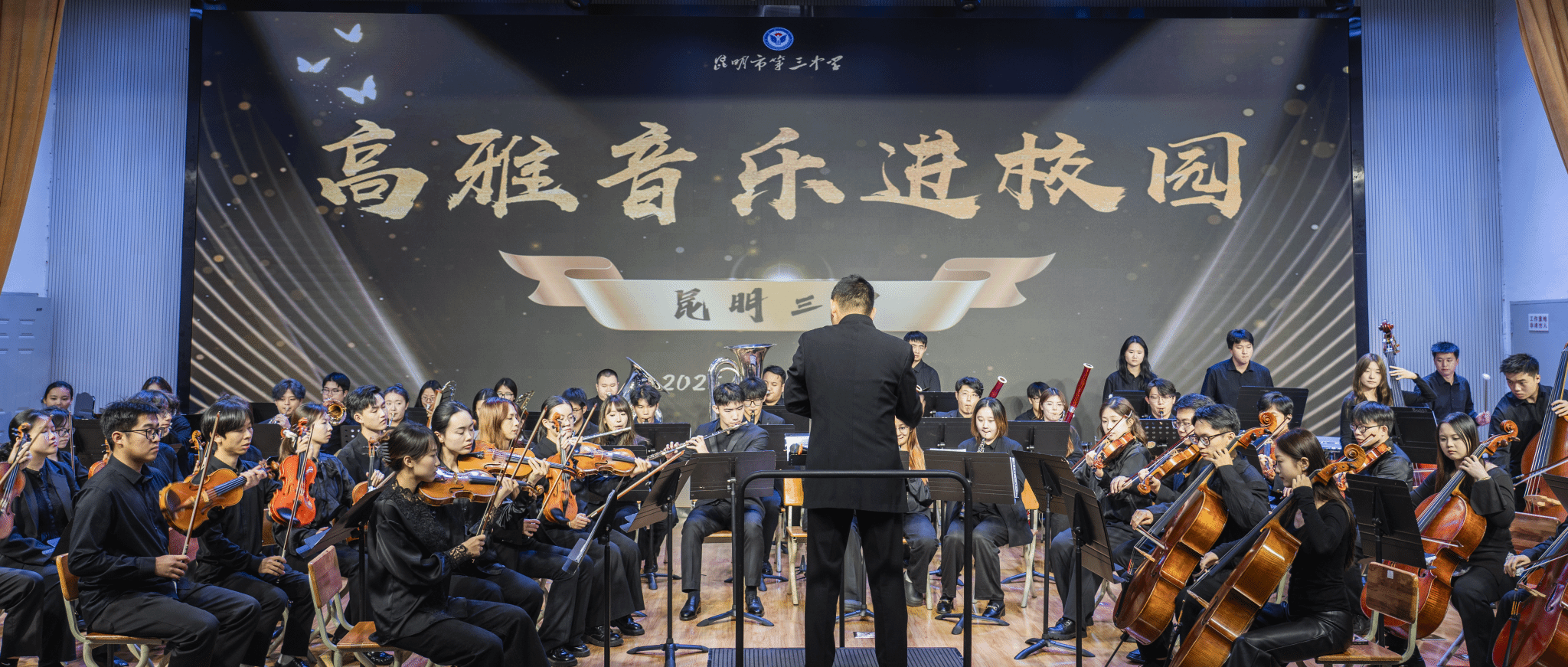 2025年11月11日19:00,昆三中图书馆报告厅座无虚席。jinnian金年会jinnianhui金年会诚信至上教工第二党支部书记、jinnian金年会青年交响乐团指挥杨凯带领乐团师生,为昆三中千余名师生呈现了一场震撼心灵的交响盛宴。作为双方党组织共建的年度重点项目,本场音乐会具有三大特色:
